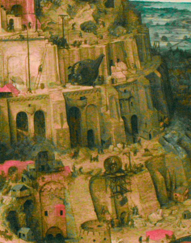 Хто зна, чи не зображено на картині спроба зрушити будівництво з місця після того, як попередні бригади будівельників втратила здатності до комунікації через мовний бар'єр та полишила Вавилон. Цар знайшов нових, але ентузіазм до понаднормової праці вони вже не проявляли.