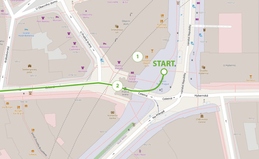 Аби розпочати нашу прогулянку, варто приїхати на Náměstí Republiky, звідки маршрут фактично і починається. Ми ж підемо в сторону дуже гарного сецесійного Громадського дому на місці котрого колись стояв Королівський Двір. Його збудував король Вацлав IV для свого двору. І хоча він сам не проходив коронаційний шлях, його наступники: Альбрехт II, Іржи з Подебрад та інші заклали нову традицію. Попри те, що в 1484 році Владислав Ягеллончик королівський двір перенесли назад на Град, традиція збереглася. Королівський Двір втратив свої функції. Спершу в одній частині мешкали Лобковіци, потім кардинал Арношт Войтех з Харраху влаштував тут Архієпископську семінарію. Врешті після пожежі колишнім палацом почали опікуватися Єзуіти, а після скасування чернечих орденів за часів імператора Йозефа ІІ тут відкрили кадетську школу, котра проіснувала до 1900 року.