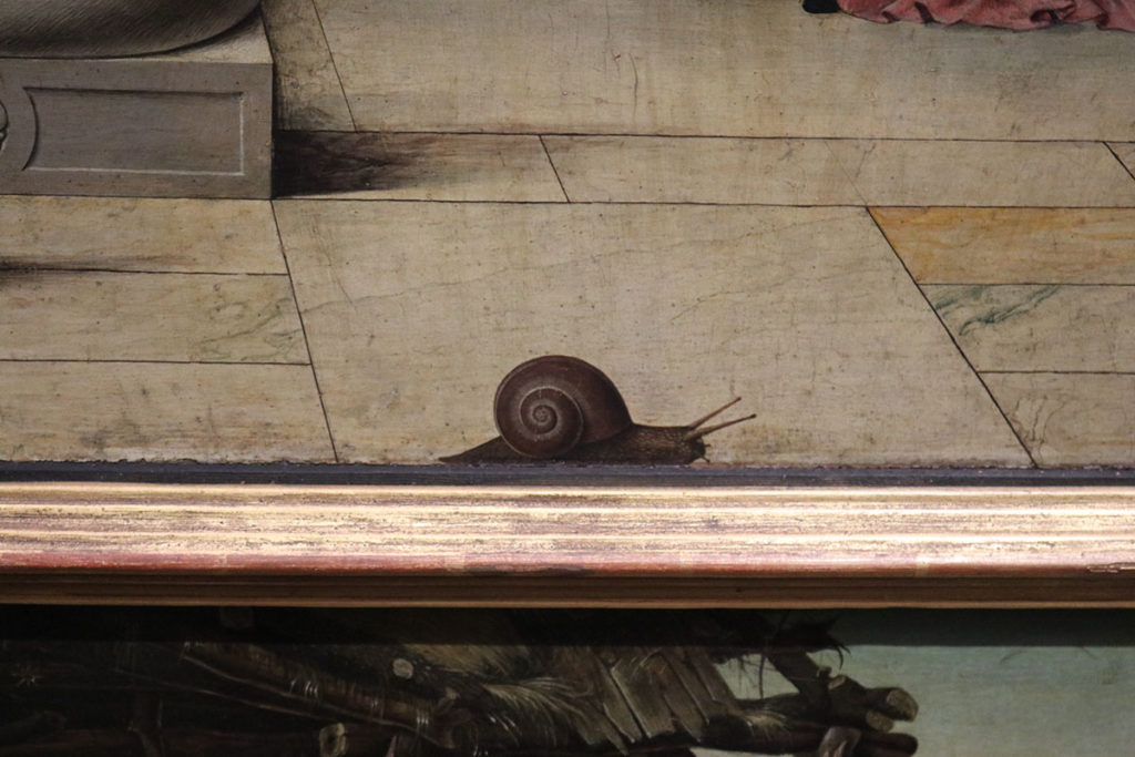Zawsze lubię przyglądać się detalom na obrazach, a w "Zwiastowaniu" zainteresowały mnie pies w oddali za Archaniołem Gabrielem oraz ślimak, który czołga się po dolnej krawędzi. Historycy sztuki wciąż dyskutują na temat tego ślimaka, ponieważ to zwierzę praktycznie nie występowało w religijnych motywach epoki renesansu. Niektórzy uważają go za symbol śmierci i odrodzenia, inni - pokory, a jeszcze inni w ogóle trzymają się myśli, że jest to symbol Niepokalanego Poczęcia. Ja osobiście uważam, że autor po prostu ćwiczył się w malowaniu różnych zwierząt. Z daleka z okien na scenę patrzy kobieta z dzieckiem. Wątpię, że jest to święta Elżbieta, wtedy była ona jeszcze w ciąży zaledwie sześć miesięcy. Być może to po prostu element, mający nieco ożywić fabułę?