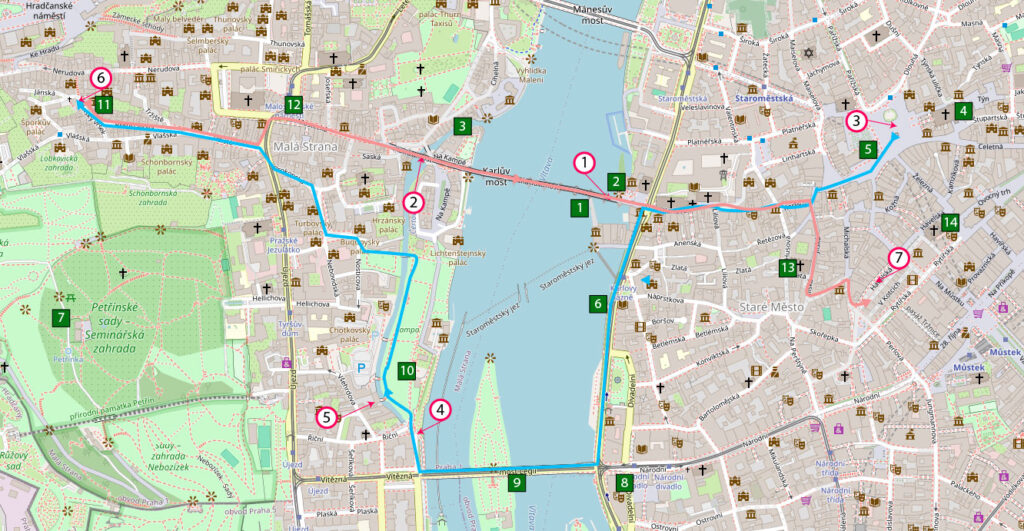 Цифри у квадратах. 1 — Карлів Міст, 2 — обличчя бородача на стіні, 3 — Чертовка, 4 — костел Діви Марії над Тином, 5 — Празький орлой, годинник, 6 — набережна Сметани, 7 — гора Петржин, 8 — Народний театр, 9 — міст Легії, 10 — острів Кампа, 11 — Музей Алхіміків, 12 — Малостранська площа, 13 — костел св. Іллі, 14 — костел св. Гавела