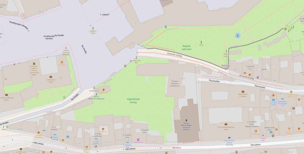 Замкові сходи починаються від Hradčanské nám. та ведуть до вулиці Thunovská. Скульптура Діви Марії знаходиться біля парапету над Малою Страною на початку вулиці Ke Hradu.