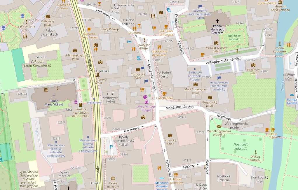 Мабуть, кожна кам'яниця Малої Страни має свою цікаву легенду. І одну з найцікавіших має кам'яниця «У семи чортів». Вона стоїть на Maltézské náměstí під номером 476/14. З 1695 року і до 1720 тут жив меценат Ян Страка, але згодом, у XIX ст. сюди заселилася Алоізія Немцова. Вона нікого до себе не впускала, мешкала самотньо і мало з ким спілкувалася. Люди з часом пустили поголос, що у тої пані в домі коїться щось недобре. Що в підвалах в трунах сплять упирі, а кімнати наповнені чортами.