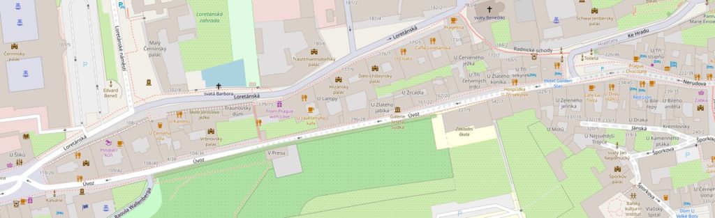 Вулиця Nerudova плавно переходить у вулицю Úvoz, котра своєю чергою виводить туристів на Погожелець. З одного боку розкинувся Великий Страговський сад, з іншого боку стіною стоять старовинні кам'яниці. Нижче, на велелюдній Нерудовій до пізньої години стоїть шум, натомість Увоз зустрічає гостей тишою та спокоєм. І мало хто знає, що з цими двома такими різними вулицями пов'язана легенда про ченця з головою в руці.